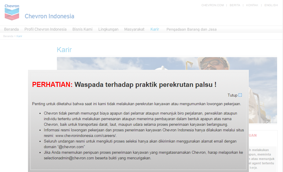 Siapa yang tidak mau kerja di Chevron tentu saja ini adalah lowongan yang menggiurkan (kalau benar memang ada). Oke bagaimana kita melakukan check bahwa ini adalah ciri lowongan kerja hoax: